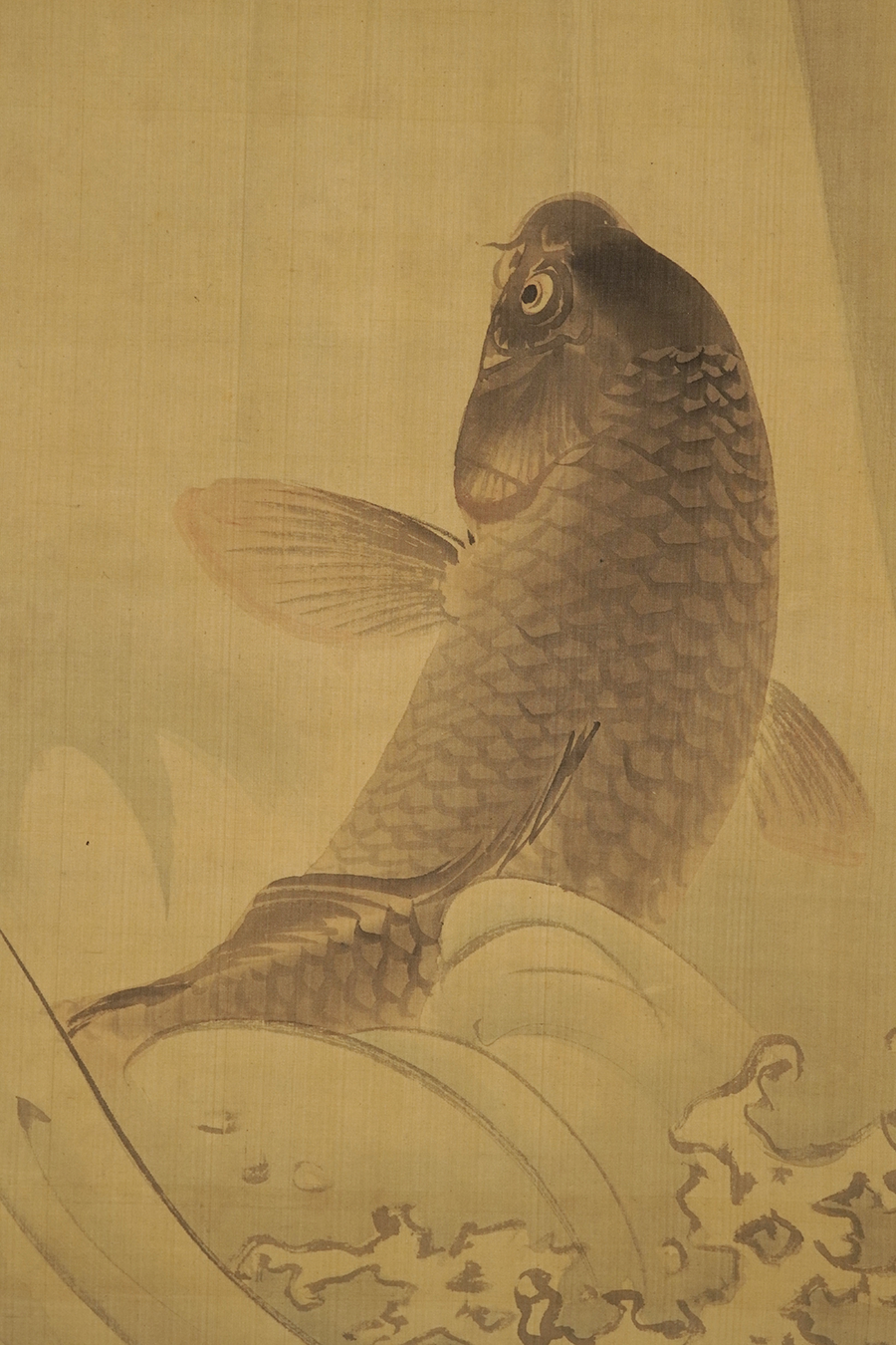 応挙の鯉といえばその写生に基づいた正確さと、活き活きとした滑らかな動き、そして時には大胆な構図で、見る者のイメージをより搔き立てる魅力があります。こちらは応挙45歳時の作品。重要文化財の『藤花図』(根津美術館)を手掛けた翌年にあたります。