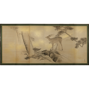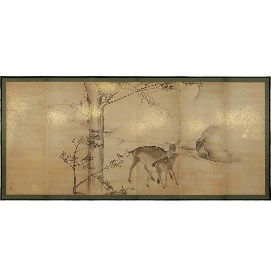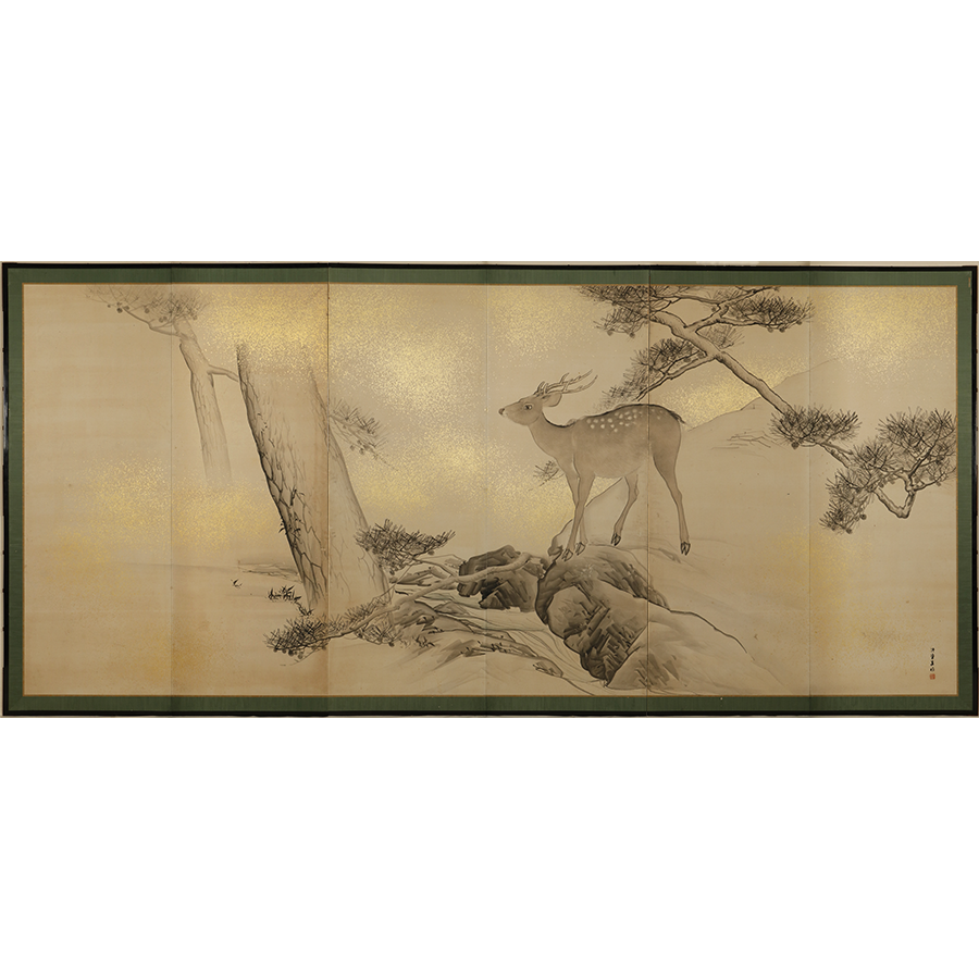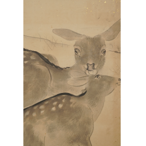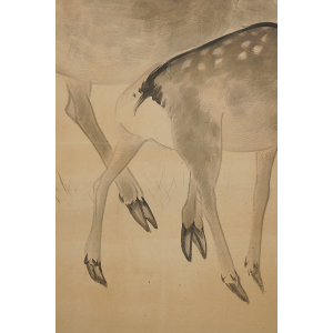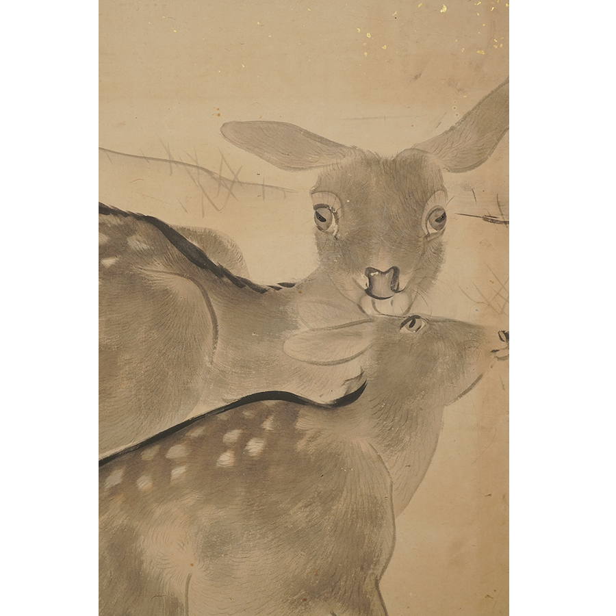 明治期の京都画壇で、森寛斎・幸野楳嶺とともに三巨頭の一人として活躍した竹堂。虎図を得意としましたが、こちらの作品では鹿の生き生きとした愛らしさも存分に描き出しています。この作品は京都府立総合資料館で開催された『岸竹堂とその芸術』展に出陳されました。