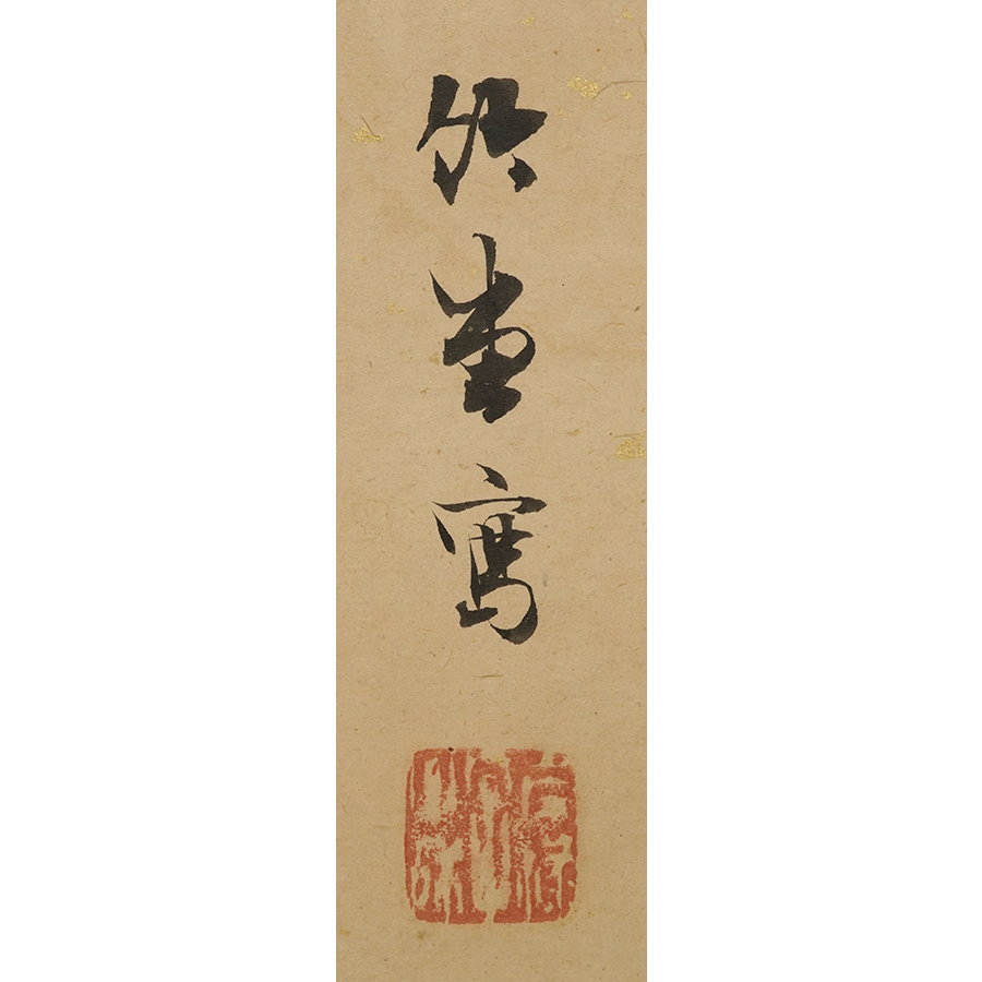 神祇官の装いでポーズをとる猿。照れ隠しのように脚を重ねて落ち着きがなさそうなところもまた愛らしく、猿画を得意とした狙仙ならではの遊び心を感じさせる一幅です。