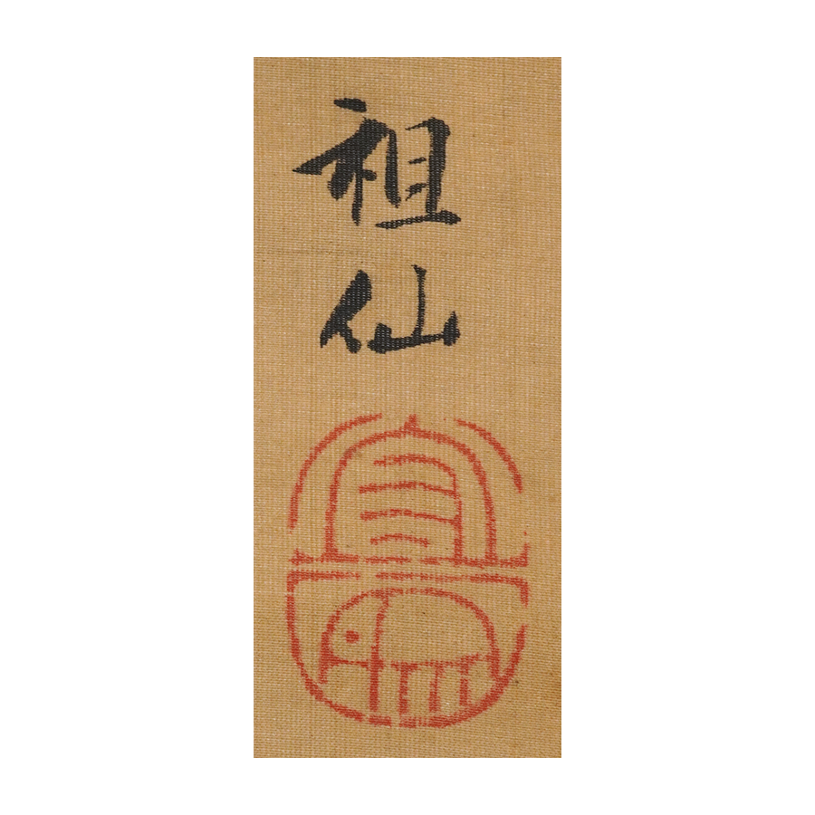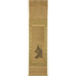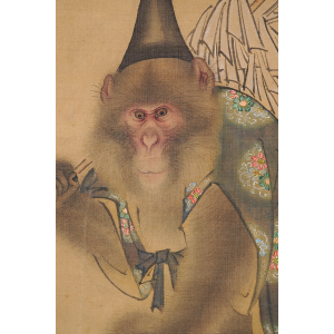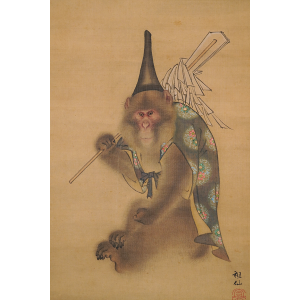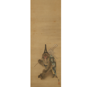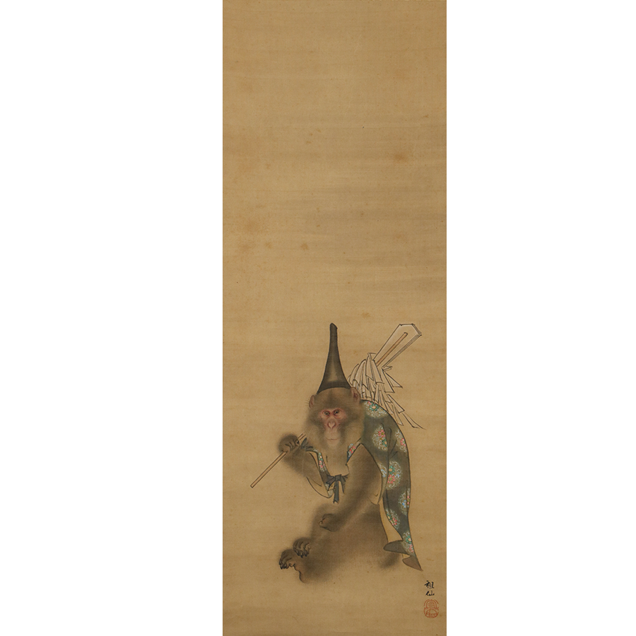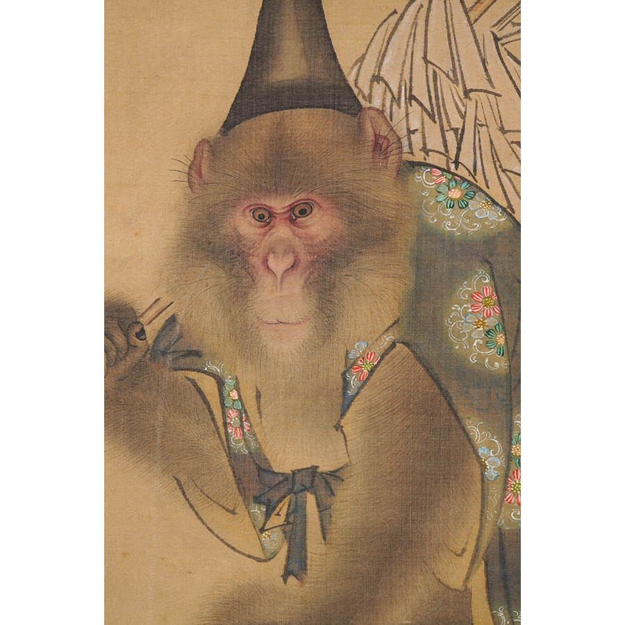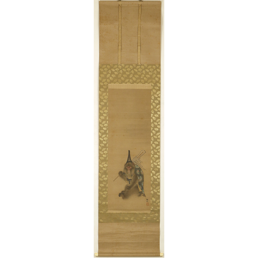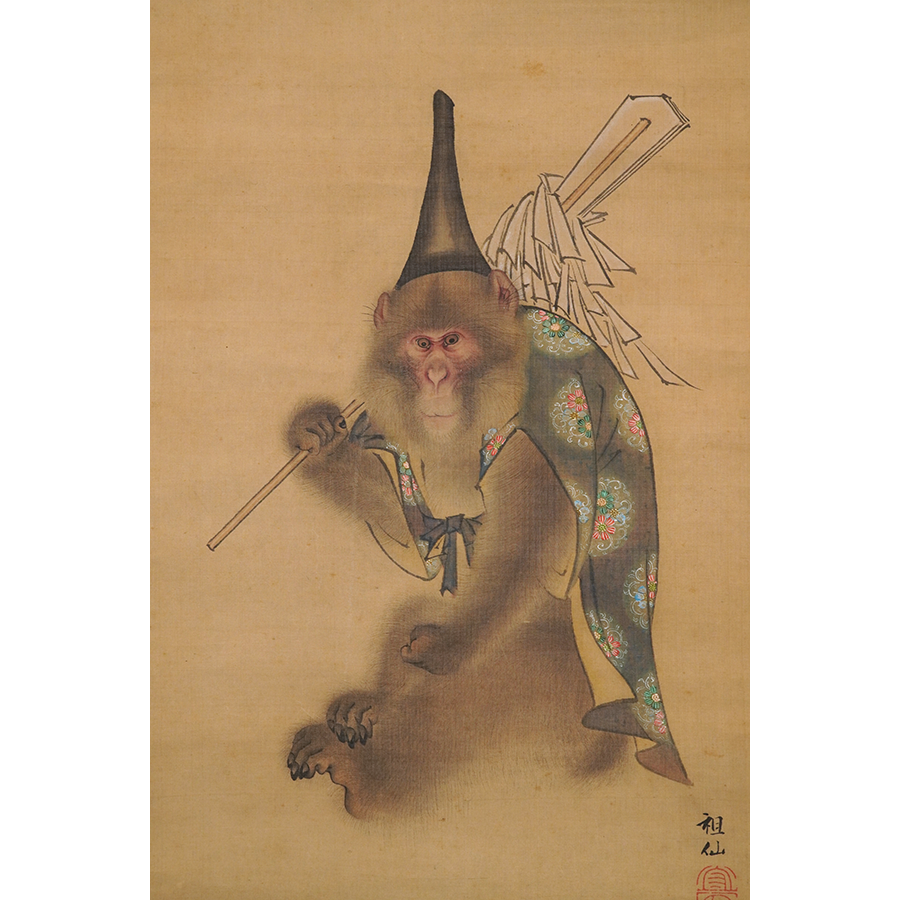 神祇官の装いでポーズをとる猿。照れ隠しのように脚を重ねて落ち着きがなさそうなところもまた愛らしく、猿画を得意とした狙仙ならではの遊び心を感じさせる一幅です。