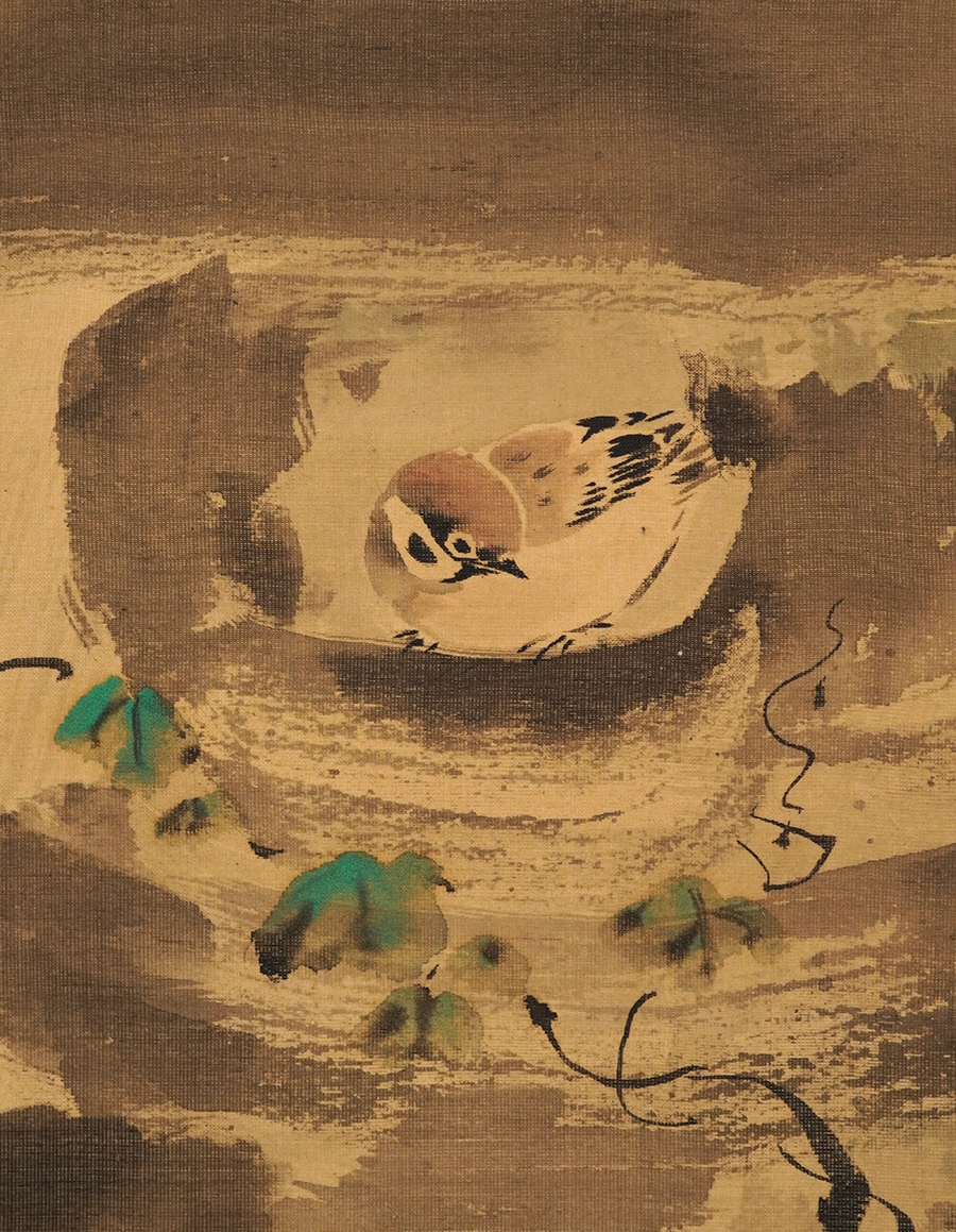 石燈籠の中で雨宿りする雀を愛らしく描いた、狩野融川による一幅です。石燈籠の部分は渇筆で大胆に描くことでざらりとした石肌を表現し、逆に絡まる蔦には垂らし込みを用いて瑞々しさを与えています。