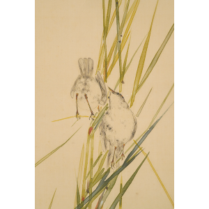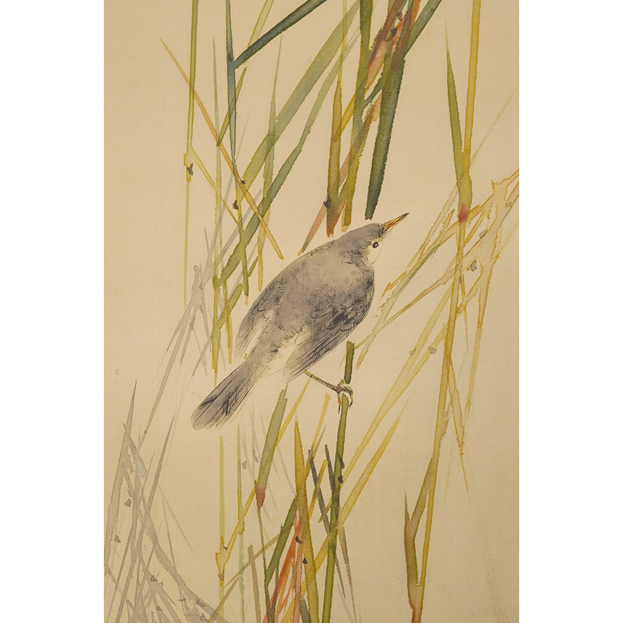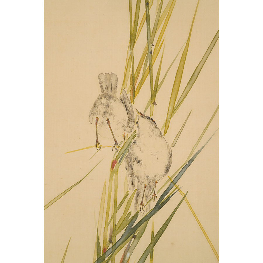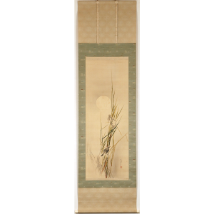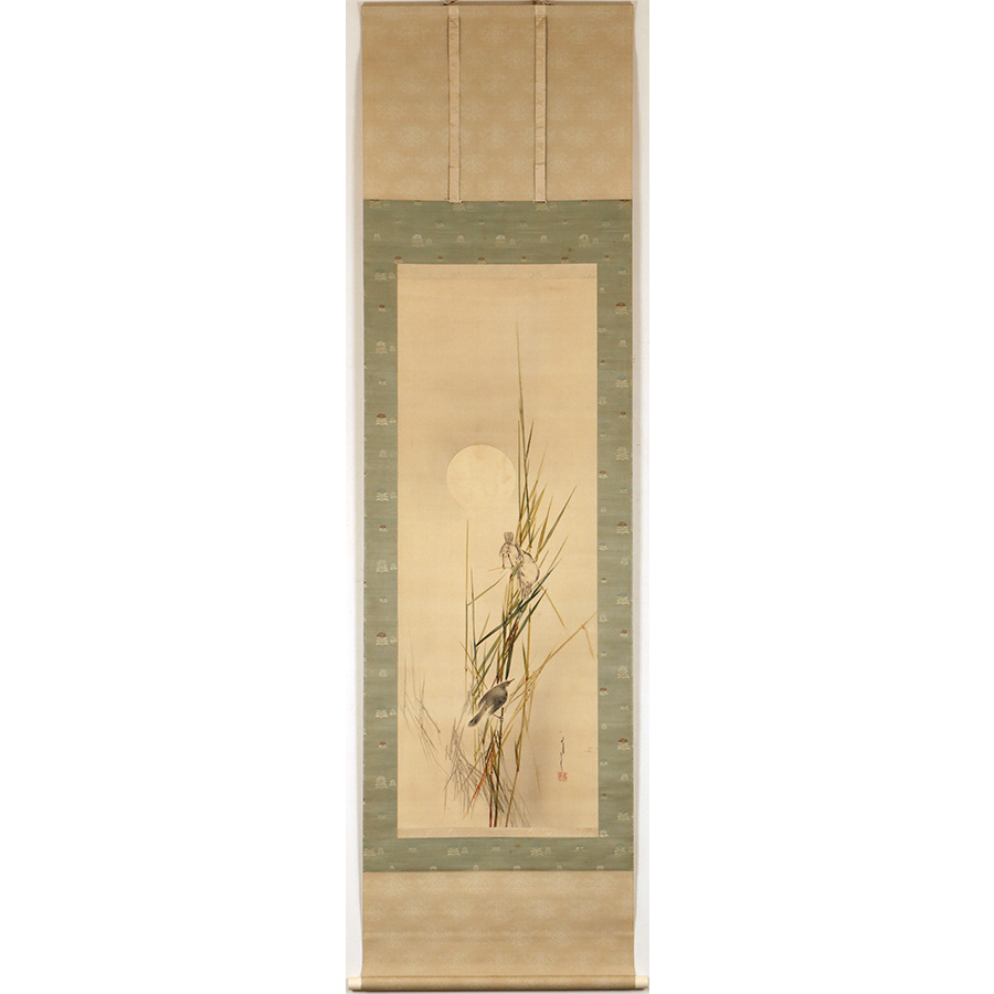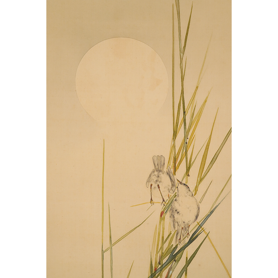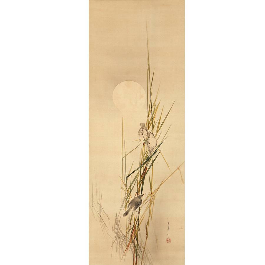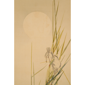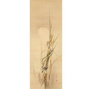 うっすらと浮かび上がる月と、その下でたむろする鳥たちを描いた静けさ漂う一幅。省亭ならではの繊細な描写と、瑞々しく透明感のある筆致が冴えています。