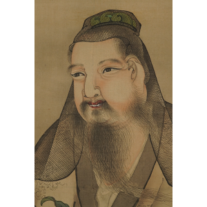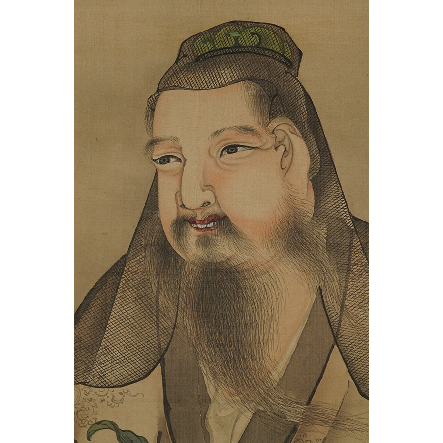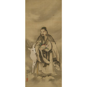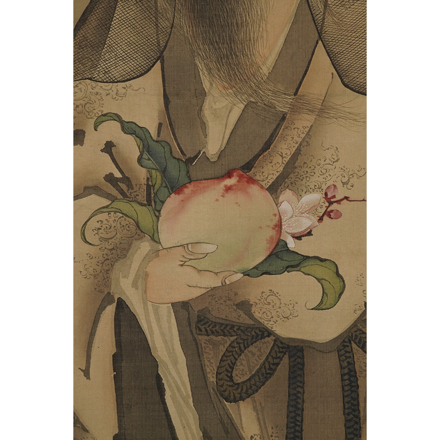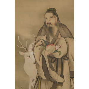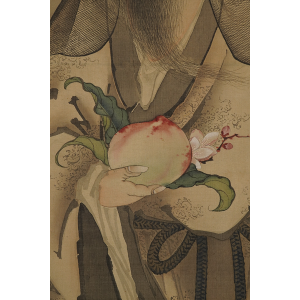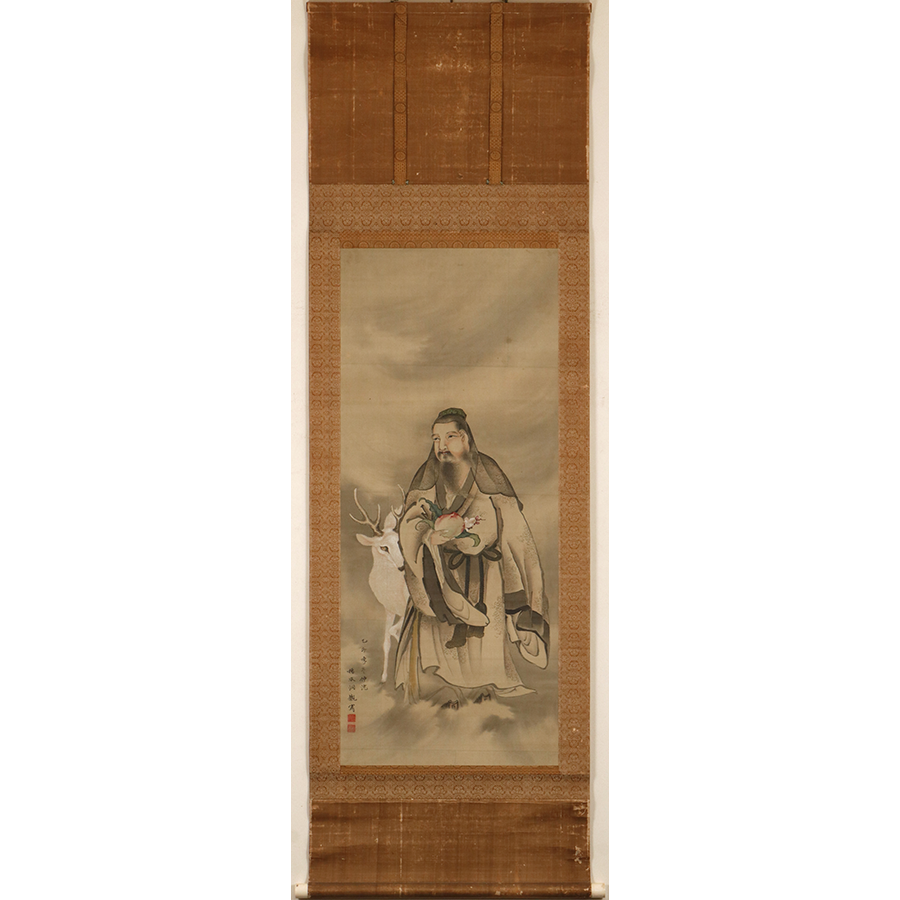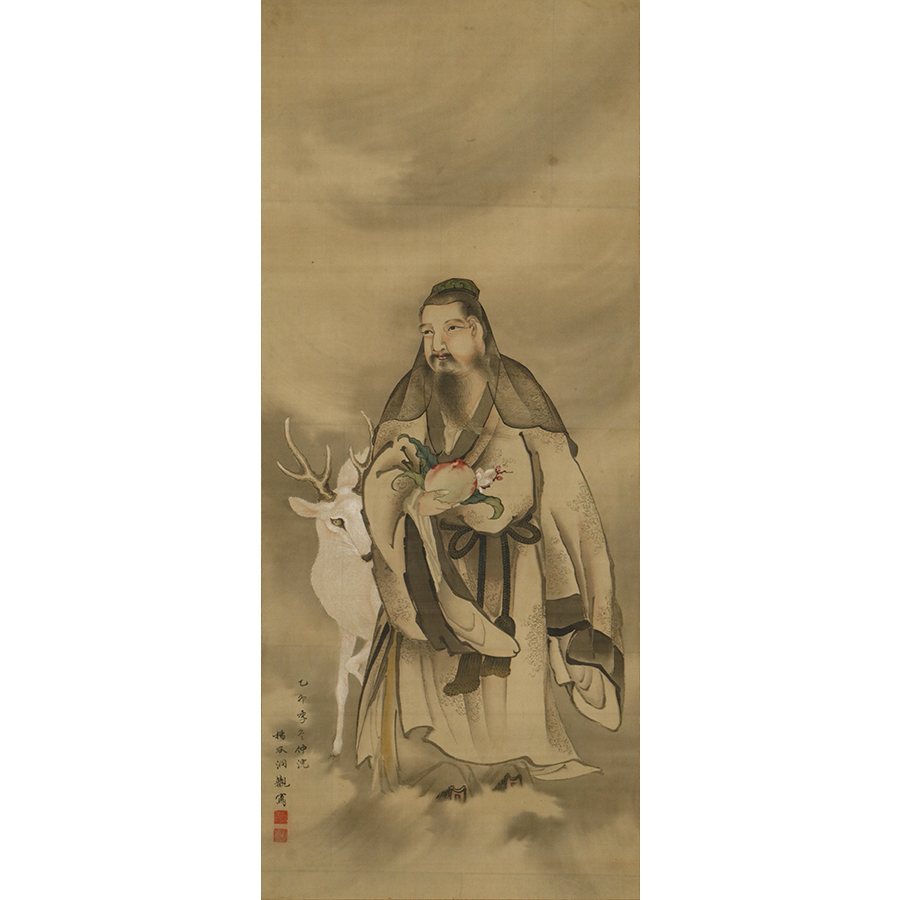 西王母の植えた桃を三度も盗んで食し、仙人となって八百歳も長生きしたと伝わる東方朔と、寄り添う白鹿。東方朔の満足げな表情とは対照的に、辺りを伺う様子で隠れる鹿の姿からは、盗みを働いてからさほど時間が経過していないのではと、想像力を掻き立てられます。