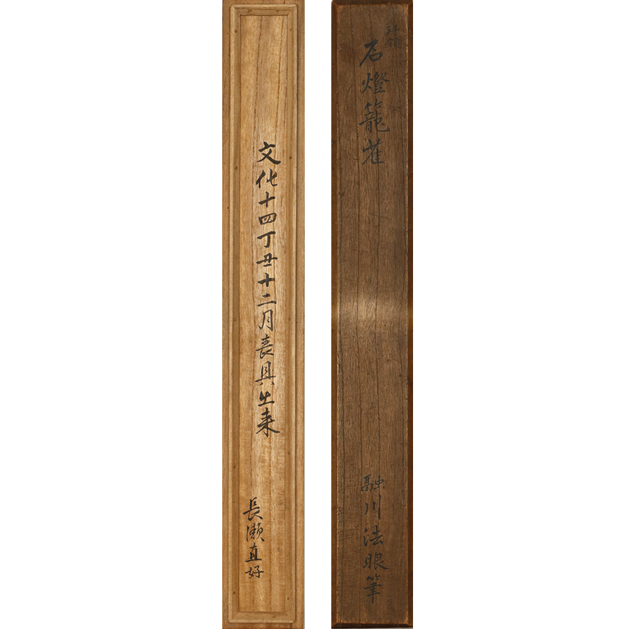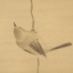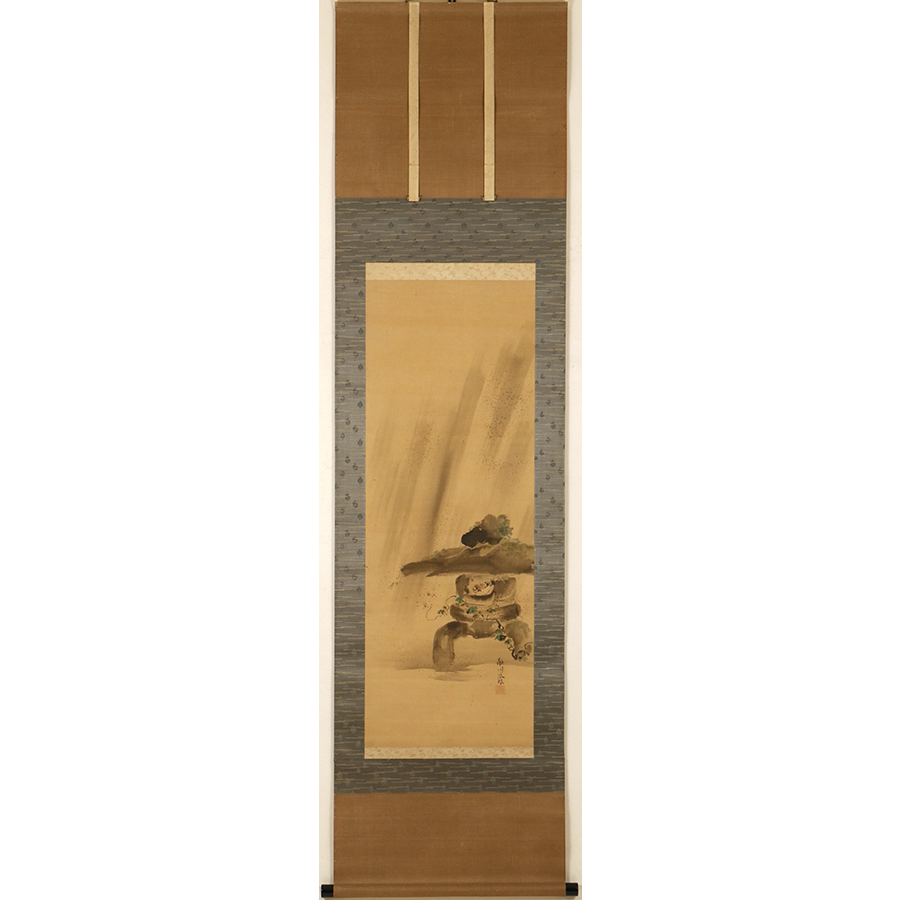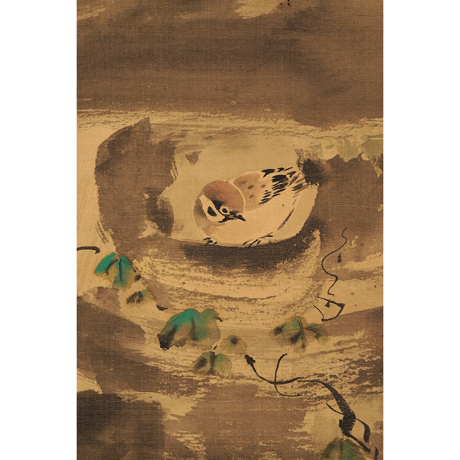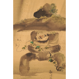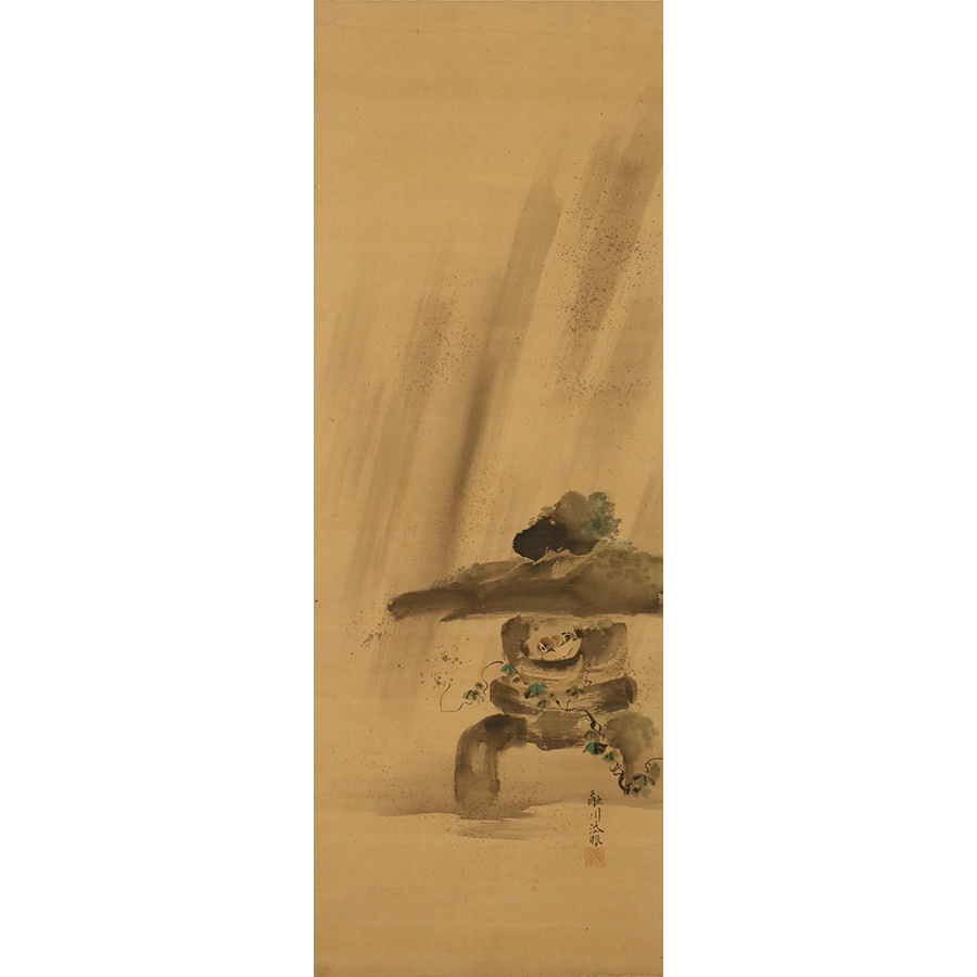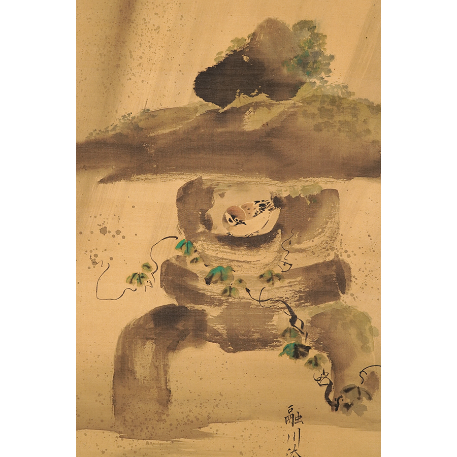 石燈籠の中で雨宿りする雀を愛らしく描いた、狩野融川による一幅です。石燈籠の部分は渇筆で大胆に描くことでざらりとした石肌を表現し、逆に絡まる蔦には垂らし込みを用いて瑞々しさを与えています。「文化十四年丁丑」の箱書から、融川が自刃した二年後に表具を仕立てたことが推測されます。
