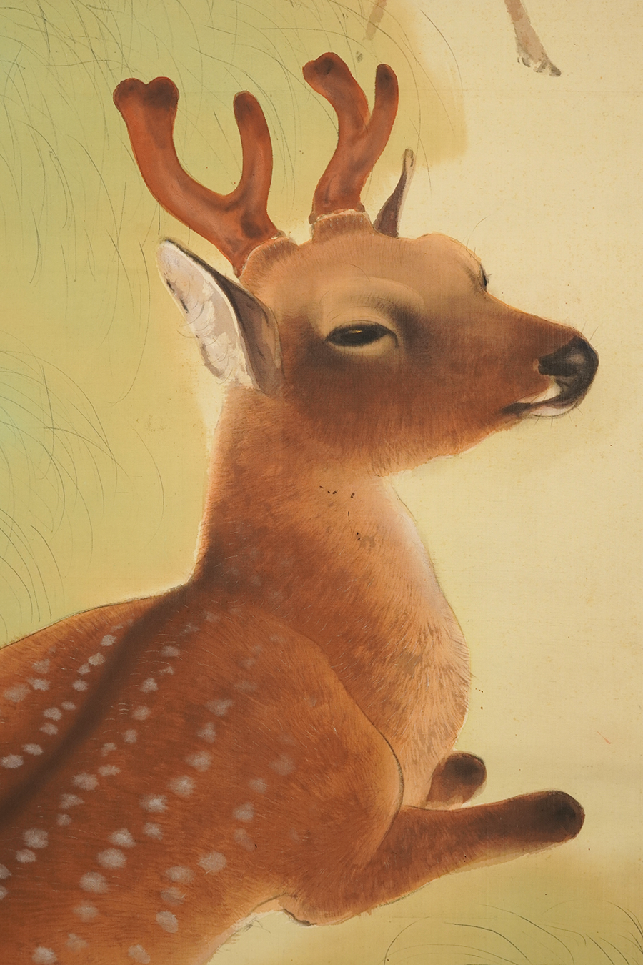 明治期の京都画壇で、森寛斎・幸野楳嶺とともに三巨頭の一人として活躍した竹堂。虎図を得意としましたが、こちらの作品では鹿の生き生きとした愛らしさも存分に描き出しています。この作品は京都府立総合資料館で開催された『岸竹堂とその芸術』展に出陳されました。