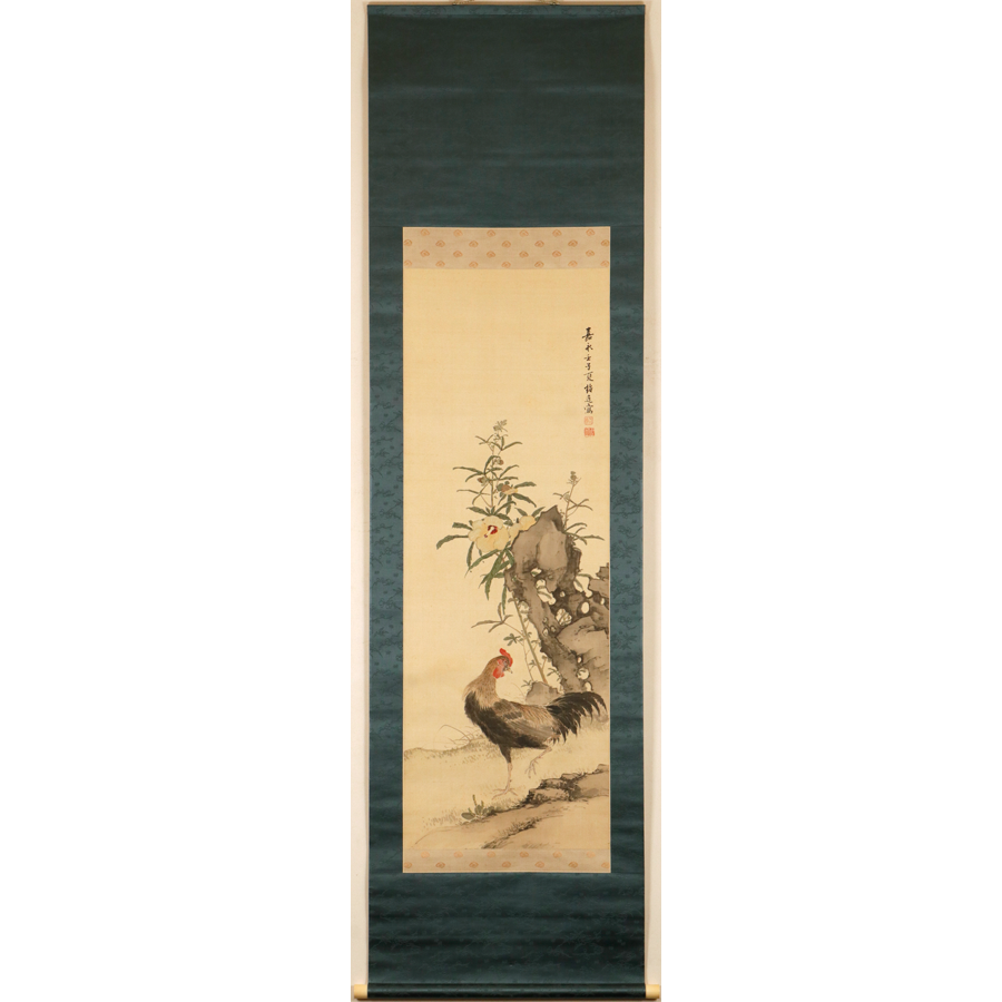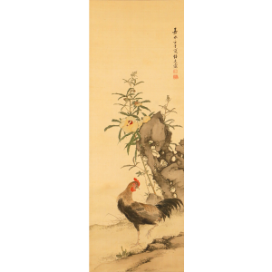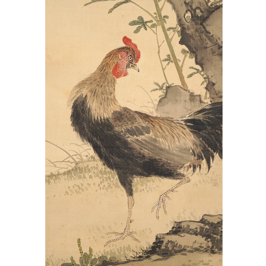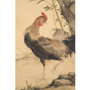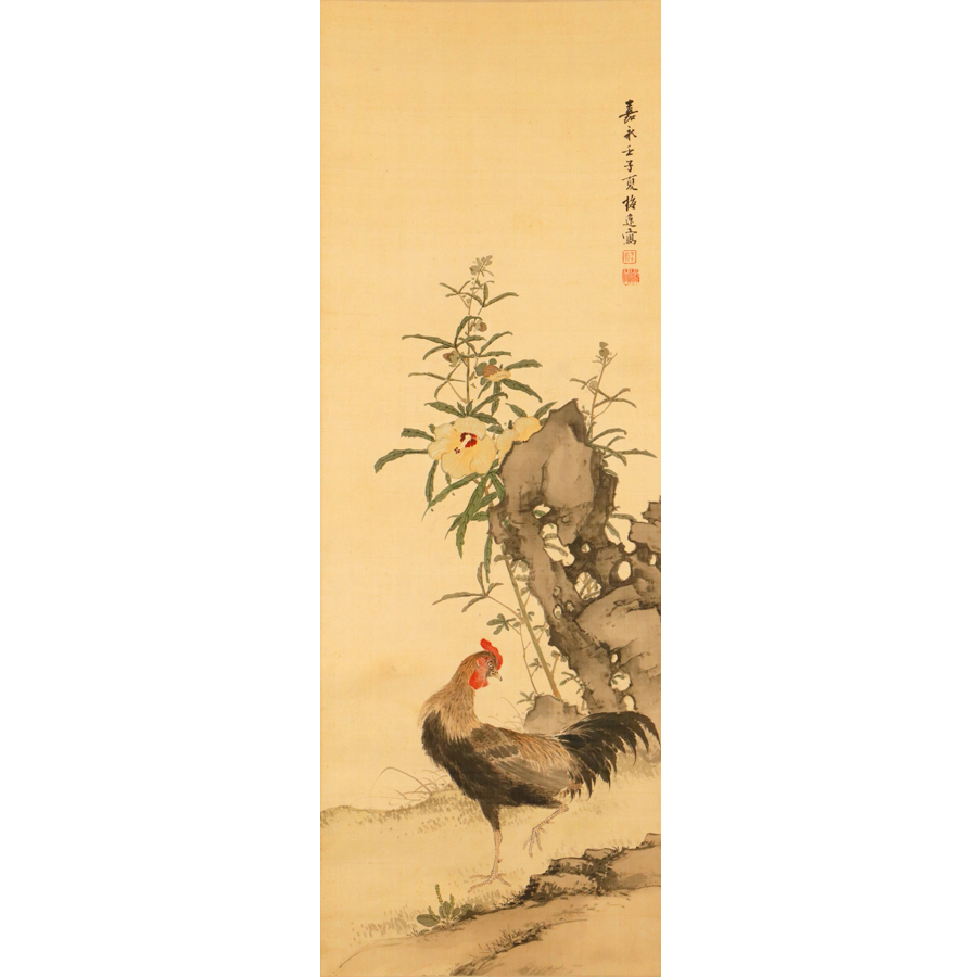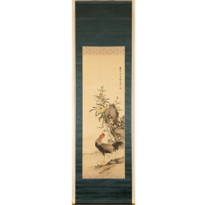 "Kouka zenkei zu (Celebratory Blessings for the Entire Family)" is a riddle-like painting theme depicting a male and female rooster with chicks. Because "qing (=Kei)" sounds the same as "chicken (=Kei)", it signifies harmony and happiness within the family, and is considered a theme that alludes to peace, tranquility, and safety in the home.